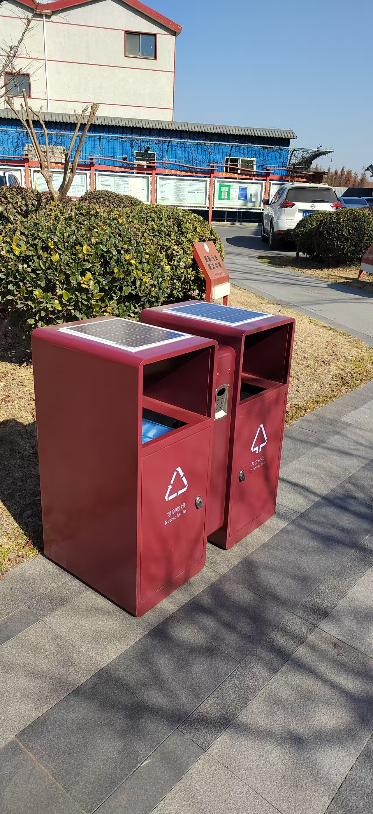 太阳能智能垃圾桶的核心特点是“光伏自供能”,通过高效光伏板将太阳能转化为电能,存储于锂电池中,满足设备日常运行需求。具体优势包括:1)零碳环保,无需外接电源,减少能源消耗;2)续航稳定,日均光照4小时可支持1-3天运行(如旗硕的单晶硅光伏板方案);3)适应户外场景,具备IP65防水、防紫外线等耐用性设计。此外,部分产品还集成智能分类、感应开盖等功能,实现“能源+智能”的双重升级。