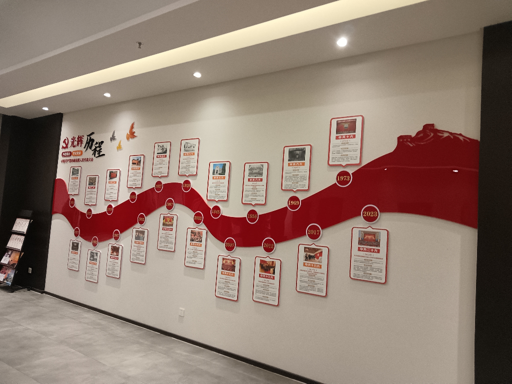 材质是文化墙“寿命”与“效果”的基础。需根据场景特性选择:潮湿环境(如茶水间)用防水UV打印+不锈钢边框;干燥环境(如办公室)选木质板材+亚克力字;户外场景(如社区宣传墙)用耐候型UV墨水+防腐实木。例如某社区党建墙项目,设计方采用“环保雪弗板雕刻+磁吸可更换展板”,既满足党建内容的动态更新,又通过环保材质符合社区健康需求。