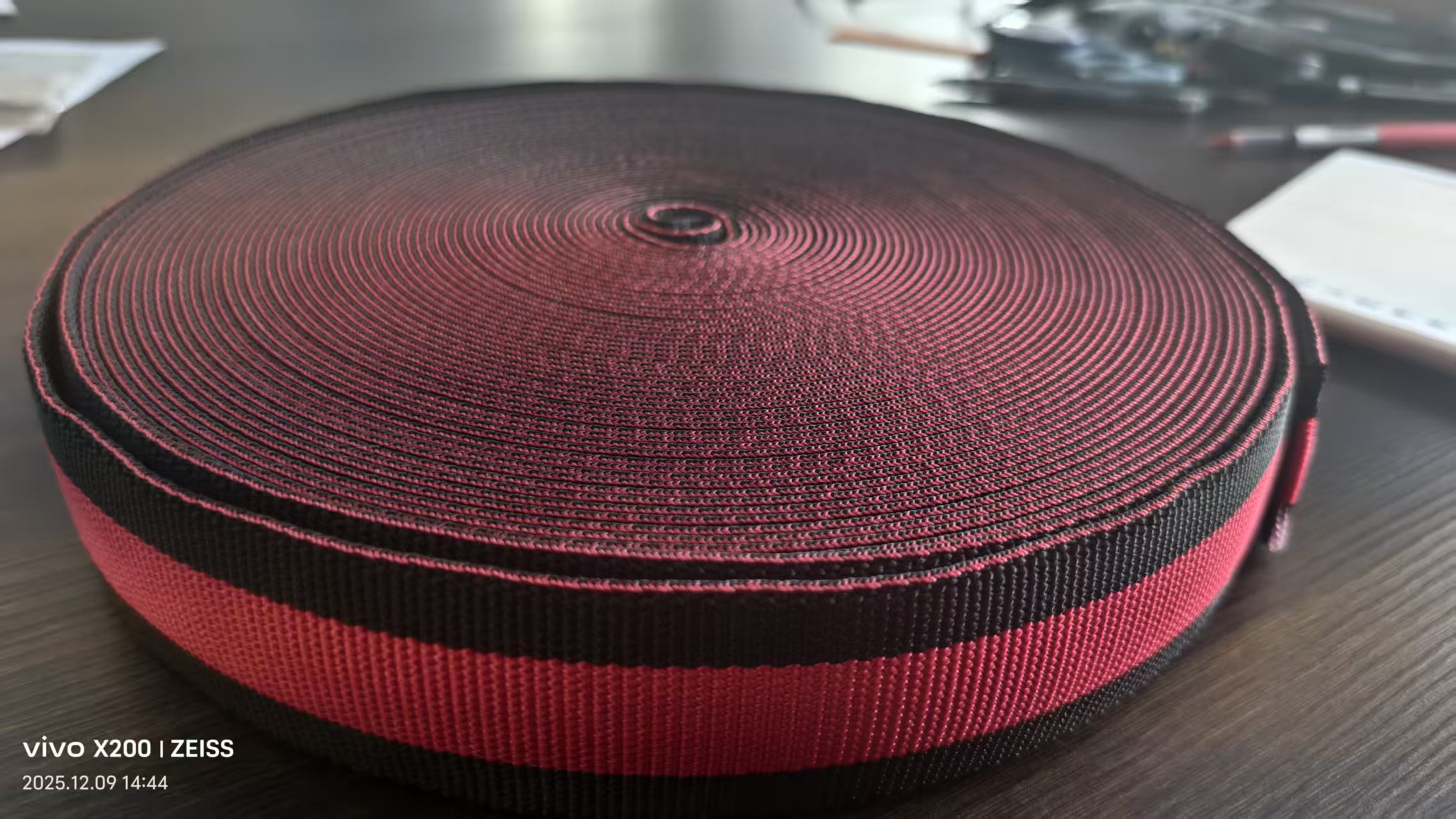 2. **定制化能力**:支持500米起订的小批量定制,潘通色卡133+色可选,小香风绳带采用涤纶+特殊捻线工艺实现丝滑纹理,工业织带通过高强尼龙66+金属丝混织达到5000N断裂强度;